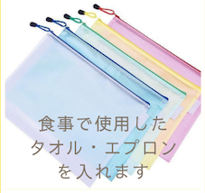 | ハンドタオル3枚 | エプロン3枚 | ファスナー付き ビニールケース1個 |