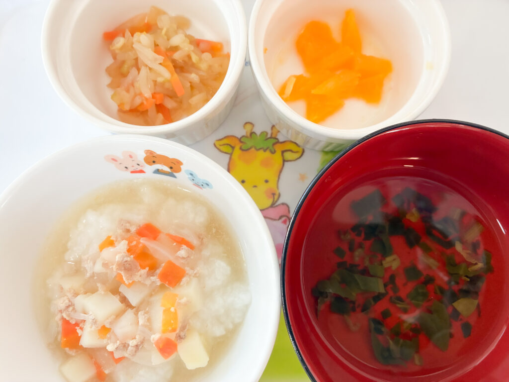 1月16日金曜日 カレーライス 手作りルーのカレーライス具は豚肉・玉ねぎ・にんじん・じゃがいも・にんにく かきたま汁 ほうれん草と卵のスープ出汁はかつお節でとっています もやしの酢の物 もやし・きゅうり・にんじんの酢の物 フルーツ オレンジ 3時のおやつは【コーントースト】 【離乳食】 豚ひきあんかけ粥ほうれん草のスープもやしの和え物オレンジ 一覧 前の記事 次の記事