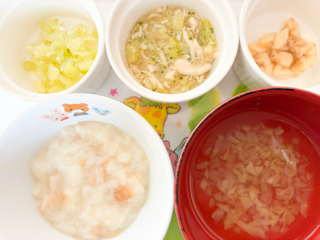 11月13日木曜日 食パン キャベツとベーコンのスープ キャベツとベーコンと玉ねぎのコンソメベースのスープ ポークケチャップ 豚肉と玉ねぎをおろしにんにくやケチャップ・ソース等で味付け フレンチサラダ キャベツ・きゅうり・みかんを手作りドレッシングで和えたサラダ フルーツ バナナ 3時のおやつは【カレーピラフ】 【離乳食】 キャベツときゅうり・ささみと野菜の出汁煮・バナナパン粥・キャベツと玉ねぎのスープ 一覧 前の記事 次の記事