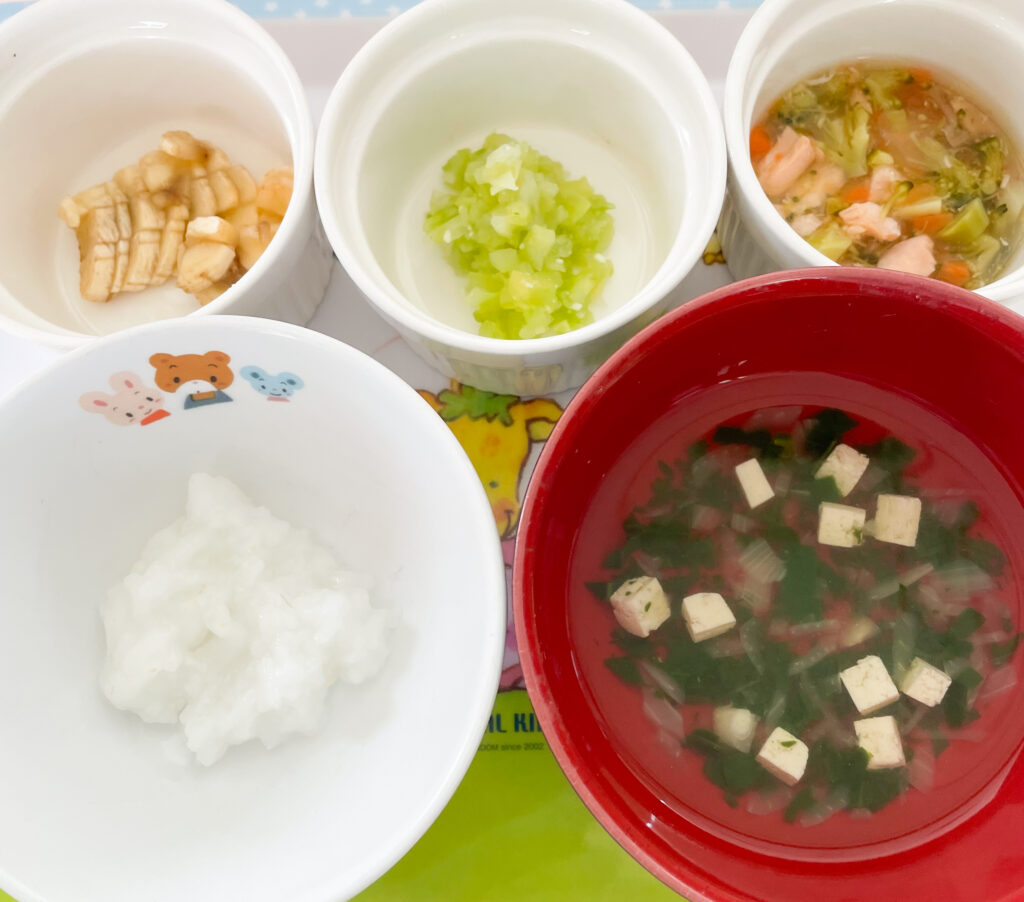 2月12日木曜日 豆腐とほうれん草の味噌汁 豆腐・ほうれん草・玉ねぎのお味噌汁出汁は煮干しでとっています 鮭のもみじ焼き すりおろしたにんじんとマヨネーズを混ぜて鮭に乗せてオーブンで焼きました ミモザサラダ キャベツ・きゅうり・ハムにゆで卵のみじん切りをトッピングしたサラダ フルーツ バナナ 3時のおやつは【おからクッキー】 【離乳食】中期 7倍粥豆腐とほうれん草のスープ鮭の野菜煮キャベツサラダバナナ 一覧 前の記事 次の記事